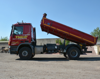 - transportiert alle Arten von Baustoffen, wie Kies, Sand, Füllkies, Mineralgemisch, Asphalt, Steine (auch auf Paletten)