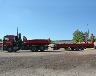 5 Seitenkipper, einen Tieflader, einen Radlader, einen Gabelstabler, eine Siebanlage, 2 Transporter und einen Ford Ranger mit einem 3-Seiten Kipper Anhänger.